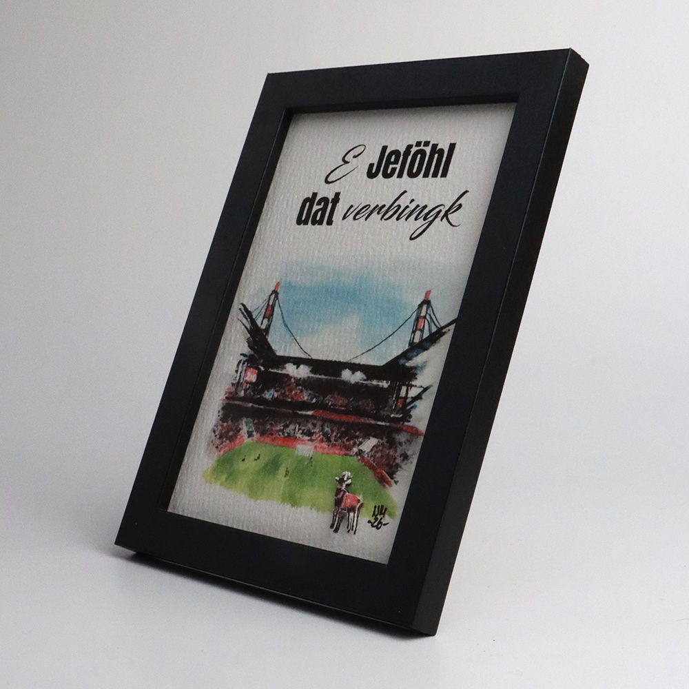 Der Kunstdruck im Format ca. 10,5 × 14,5 cm (Bildausschnitt ca. 8,2 x 11,9 cm) eignet sich ideal als Köln-Deko, Souvenir oder besonderes Geschenk für FC-Fans. Ob aufgestellt oder aufgehängt – das Motiv setzt überall einen klaren, kölschen Akzent.