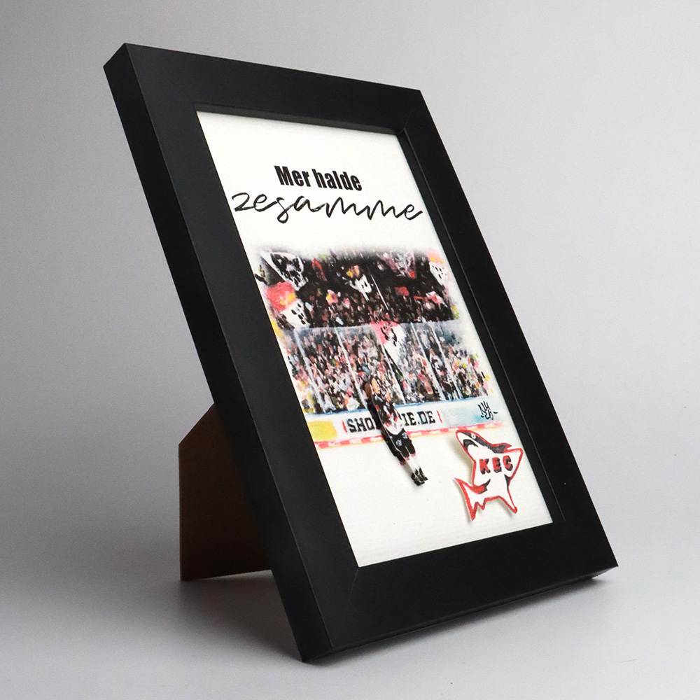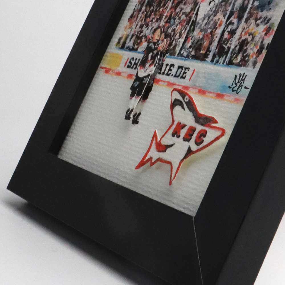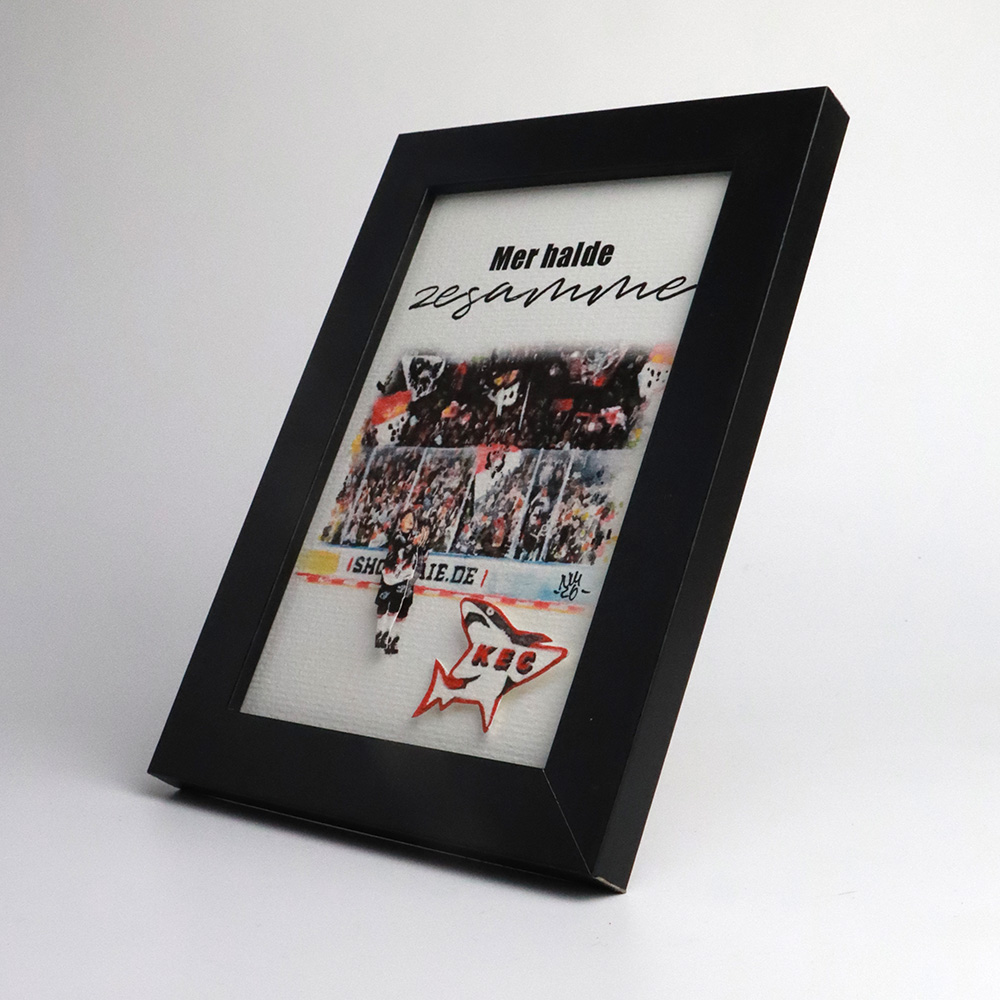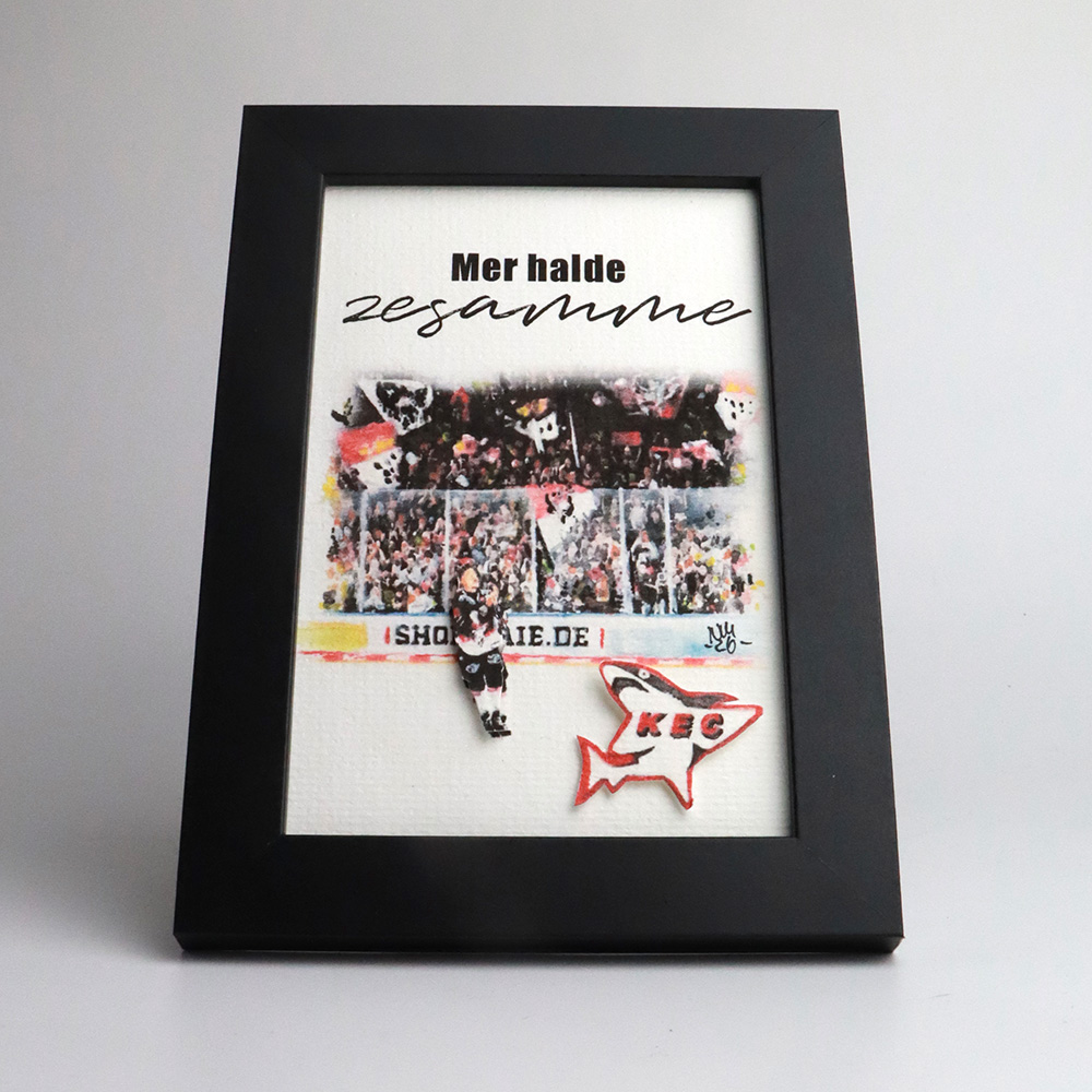 Dieser Kunstdruck der Fankurve des KEC zeigt einen hochwertigen Druck eines handgemalten Aquarells, ergänzt durch Typografie. Der Spieler und der Hai werden im 3D-Effekt hervorgehoben. Ein liebevolles Motiv für alle, die Köln, den KEC und kölsche Lebensfreude lieben.