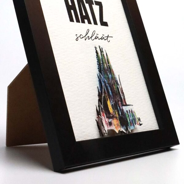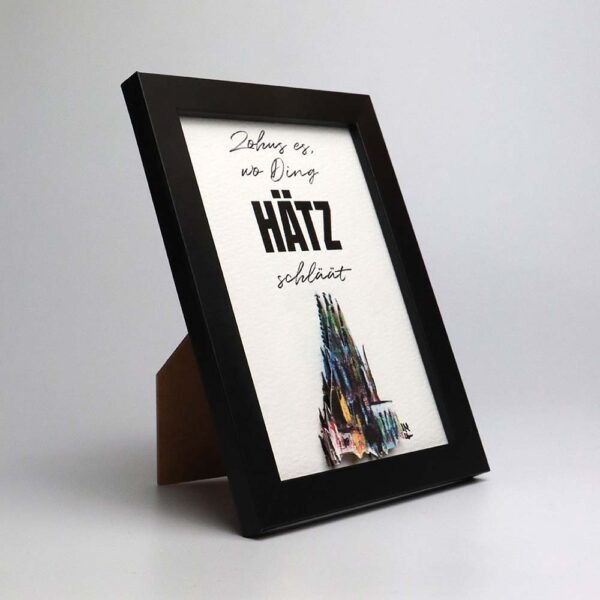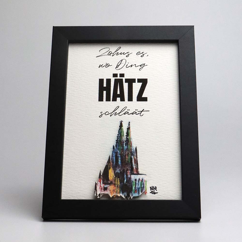 Zohus es, wo Ding Hätz schläät! Dieser Kunstdruck mit Kölner Dom zeigt einen hochwertigen Druck eines handgemalten Aquarells, ergänzt durch Typografie. Der Dom und Groß St. Martin werden im 3D-Effekt hervorgehoben. Ein liebevolles Motiv für alle, die Köln, den Dom und kölsche Lebensfreude lieben.