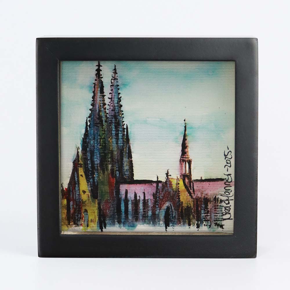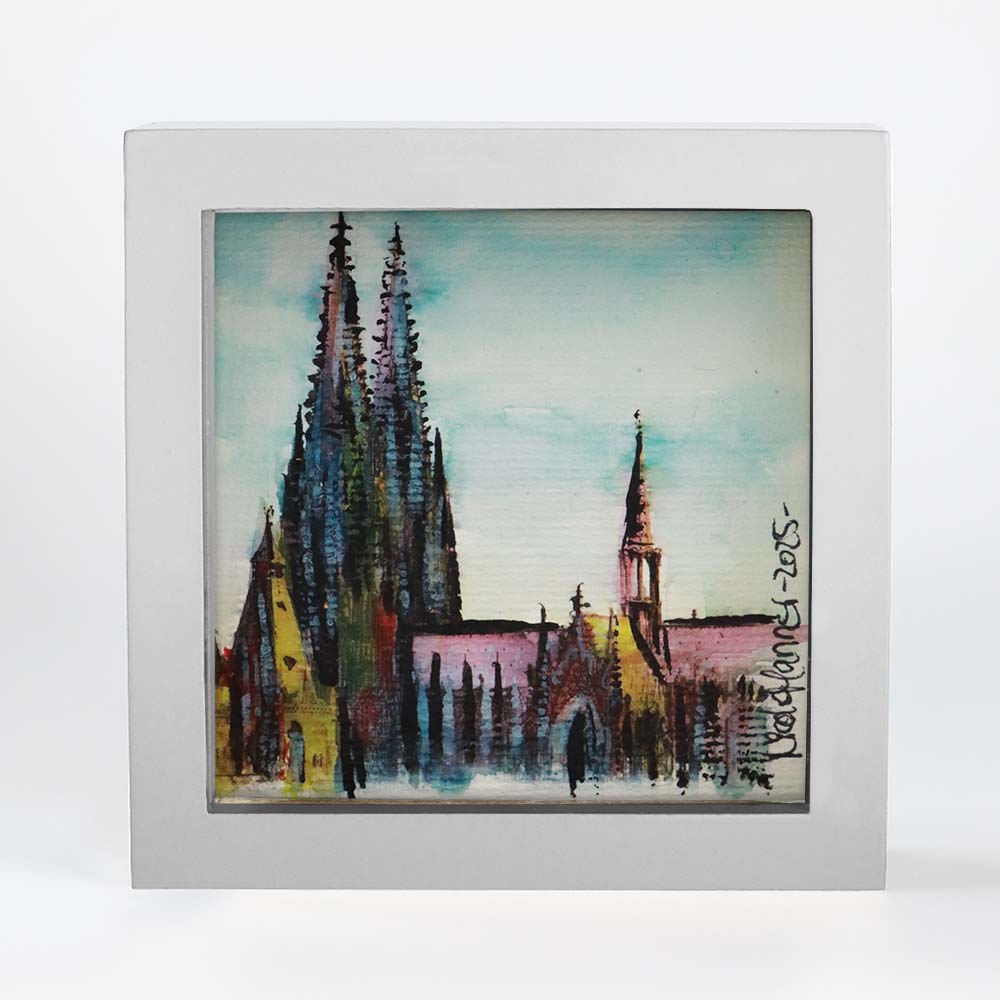 Köln-Feeling im Quadrat: Dieses liebevoll handgemalte Aquarell fängt den Blick auf den Kölner Dom in einem kleinen, feinen Kunstwerk ein – gemalt mit echtem Rheinwasser! 💧🎨
