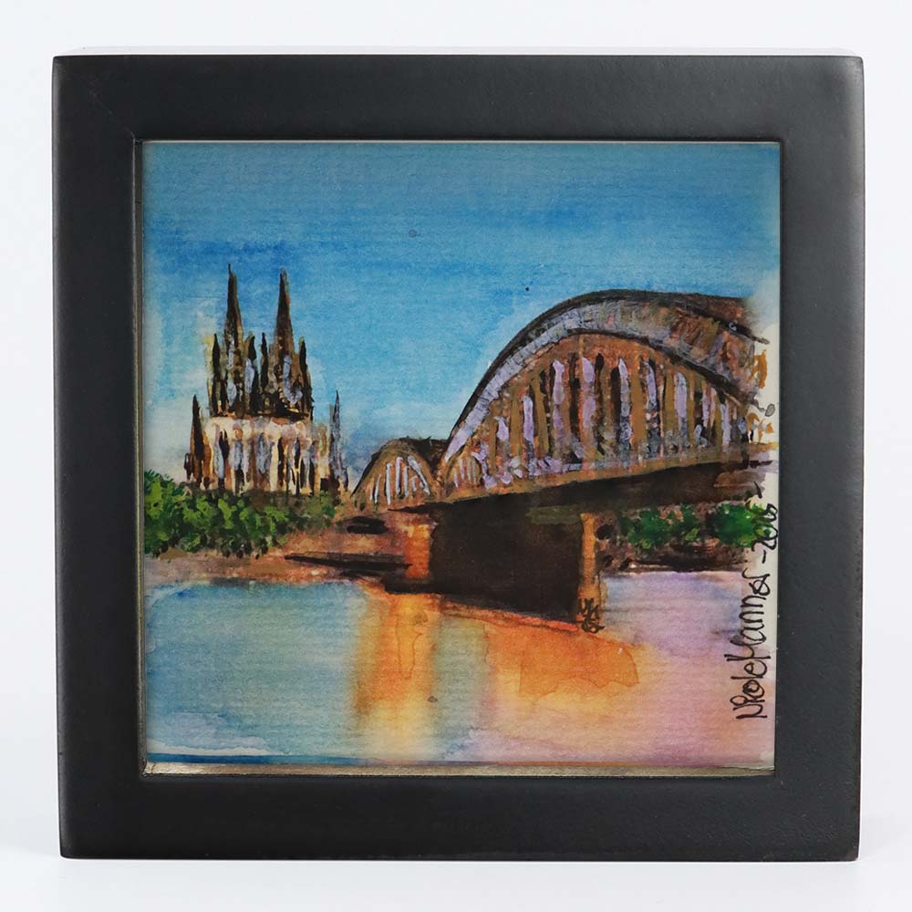 Köln-Feeling im Quadrat: Dieses liebevoll handgemalte Aquarell fängt den Blick über den Rhein auf den Dom mit Hohenzollernbrücke in einem kleinen, feinen Kunstwerk ein – gemalt mit echtem Rheinwasser! 💧🎨