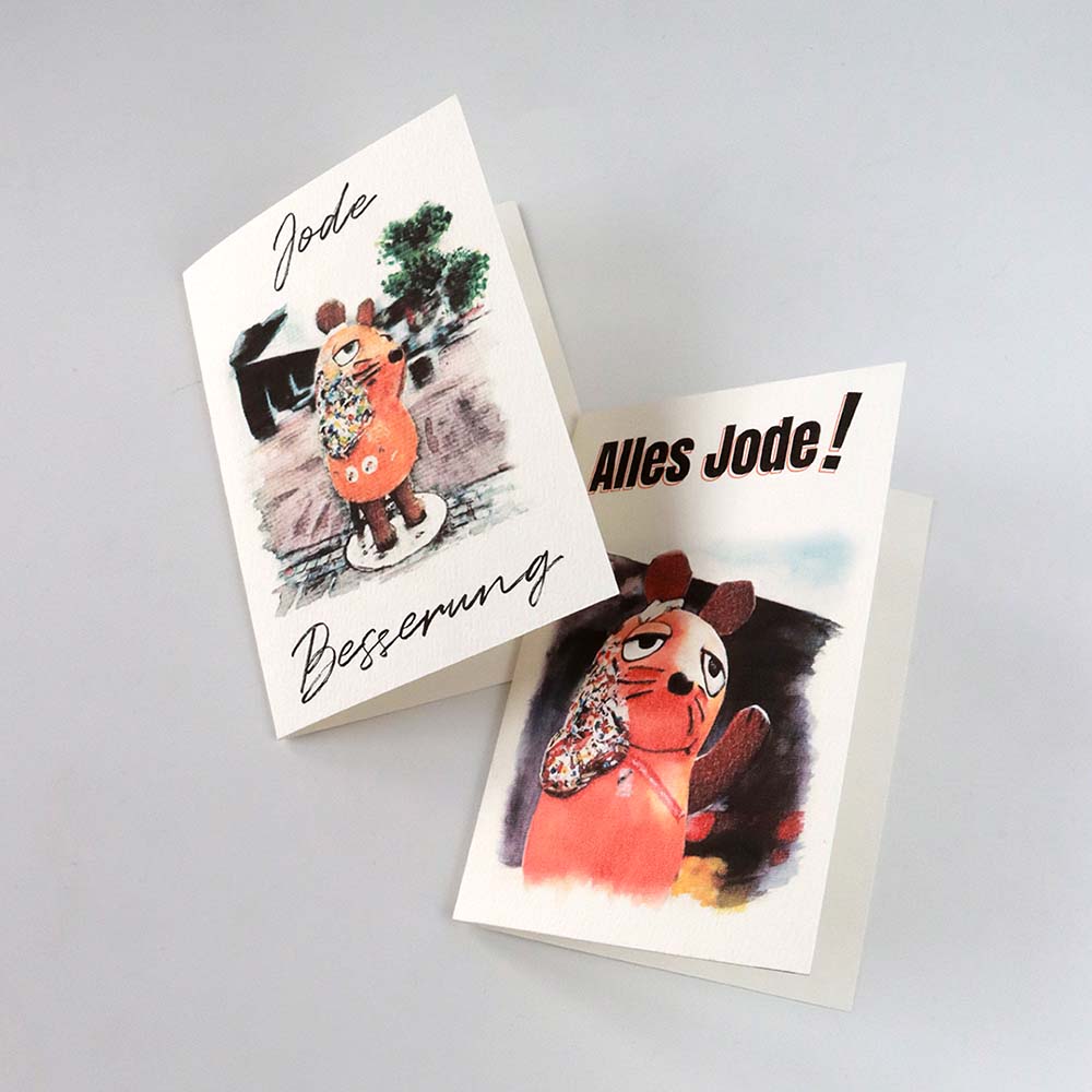 Diese beiden DIN-A6-Klappkarten zeigen die berühmte Maus-Statue in Köln – als sie liebevoll mit Pflastern „verarztet“ wurde – in einem ausdrucksstarken handgemalten Aquarell-Motiv. Jede Karte kombiniert Humor, lokale Liebe und künstlerische Gestaltung mit klarer Typografie.